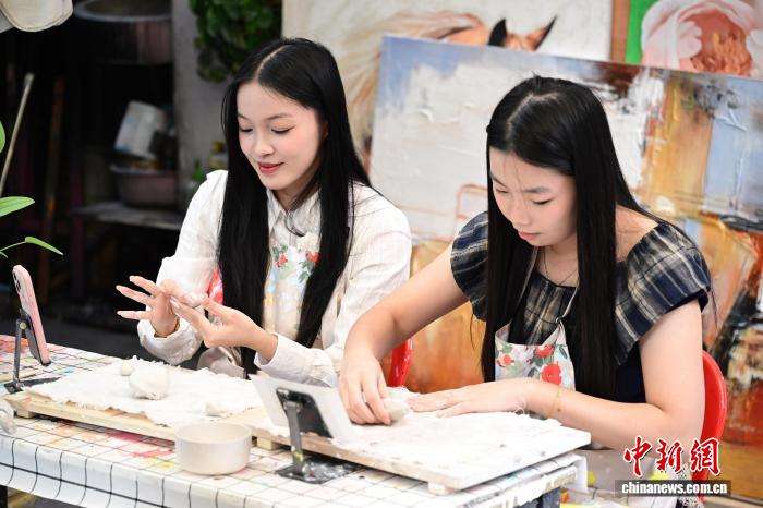 12月11日,游客在大芬油画村体验陶艺制作。