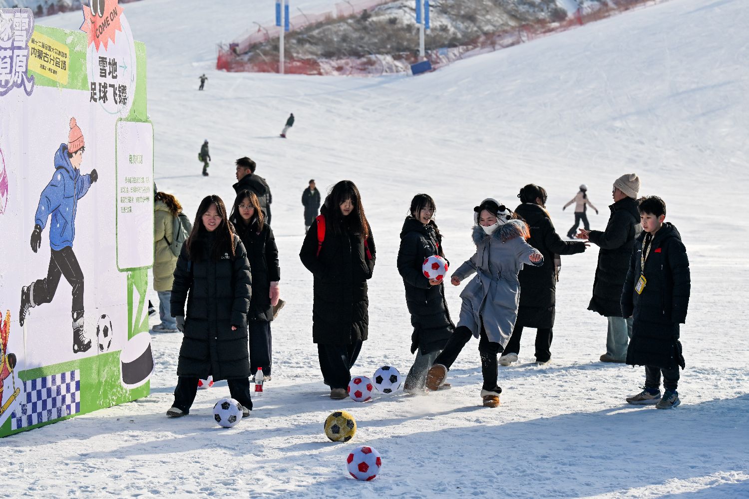 12月14日,游客在马鬃山滑雪场体验雪地足球飞镖。