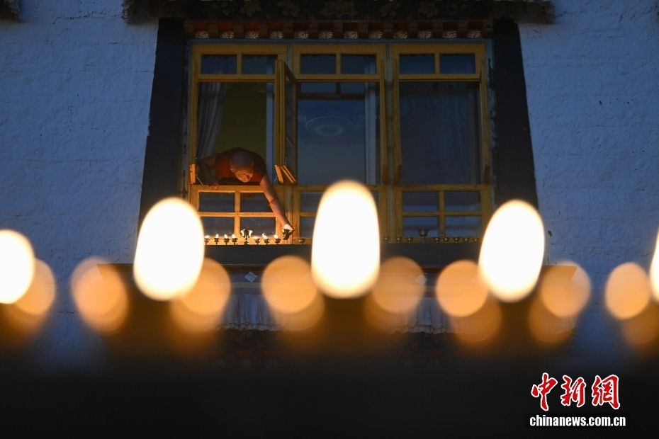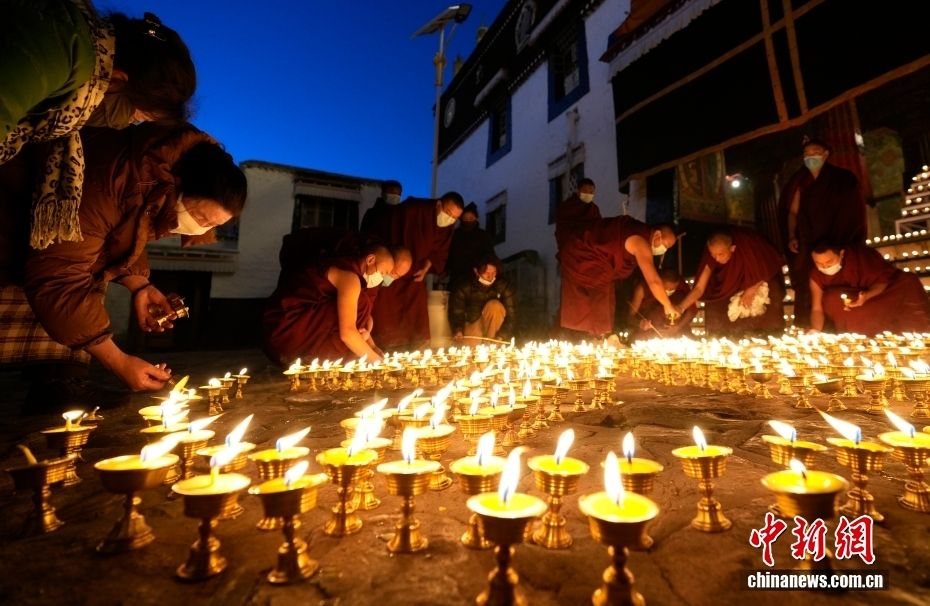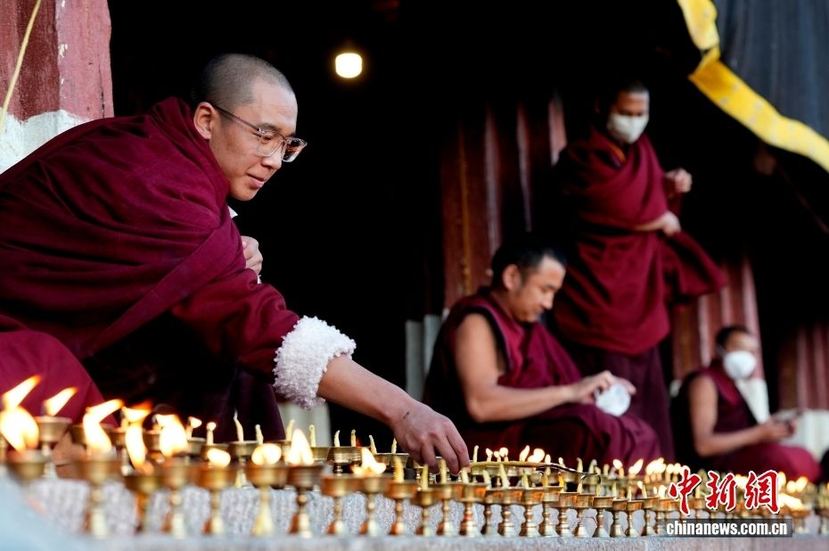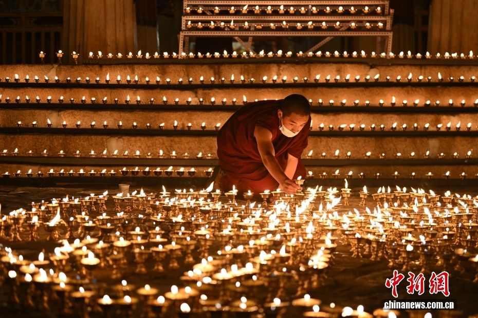 图为色拉寺内僧俗信众点燃酥油灯。(图片来源:本文图片均据中新网)