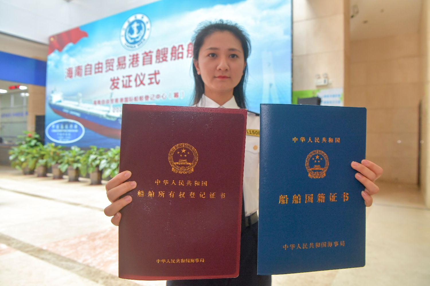 资料图为2020年6月4日,海南海事局、洋浦经济开发区管委会向“中远海运兴旺”轮颁发首张“中国洋浦港”《船舶国籍证书》,标志着船籍港为“中国洋浦港”的首艘国际登记船舶诞生,海南自贸港有关船舶登记政策正式落地实施。