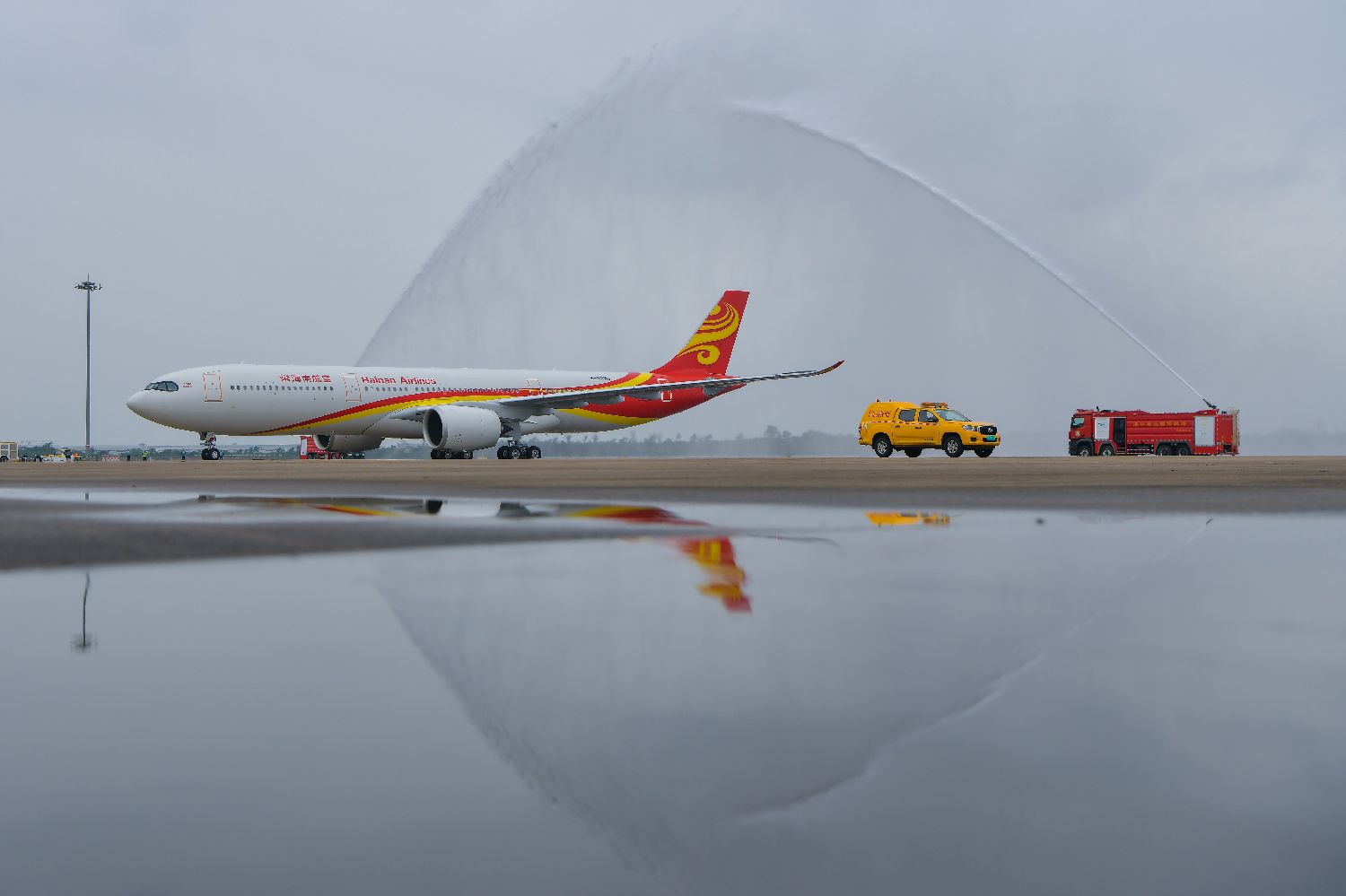 资料图为2025年11月1日,海南航空首架A330neo客机在海口美兰国际机场停机坪穿越“水门礼”。该飞机通过海南自贸港交通工具及游艇“零关税”政策享受减免税款约1.14亿元人民币,创下单票享惠数额新高。