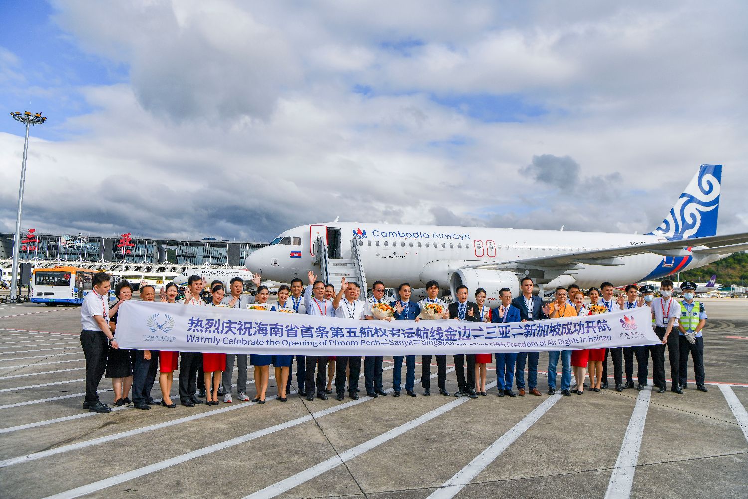 资料图为2023年12月1日,由柬埔寨航空执飞的KR9755航班从金边飞抵三亚,出席开航仪式的领导嘉宾与航班机组成员合影。这是海南自贸港开通的首条第五航权定期客运航线。