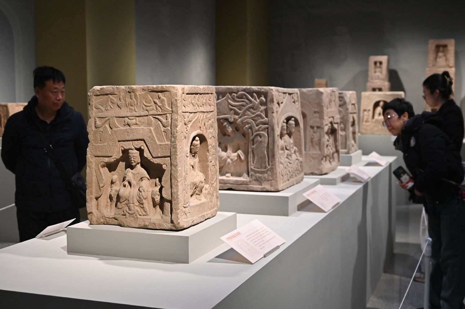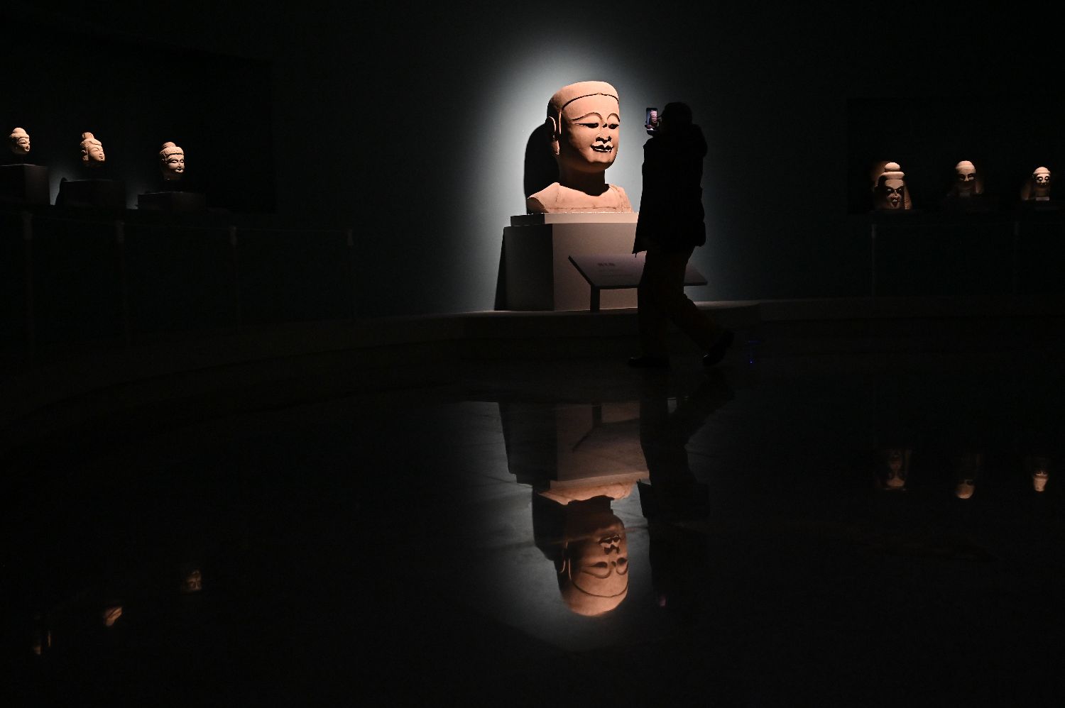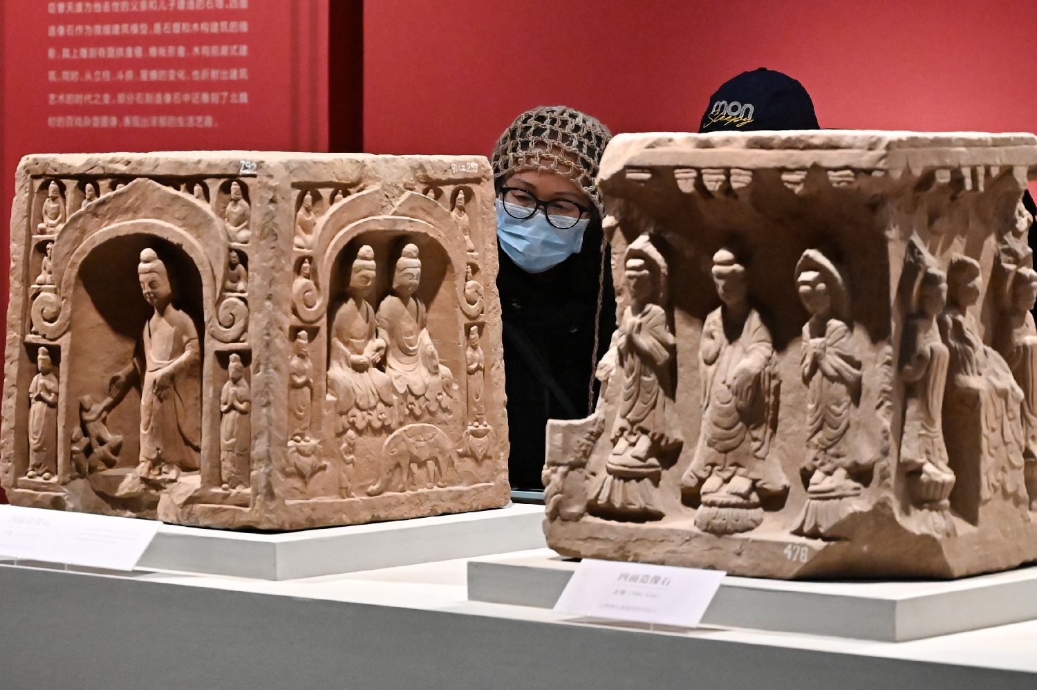 12月16日,民众参观北齐石刻——佛头像。(图片来源:中新社)