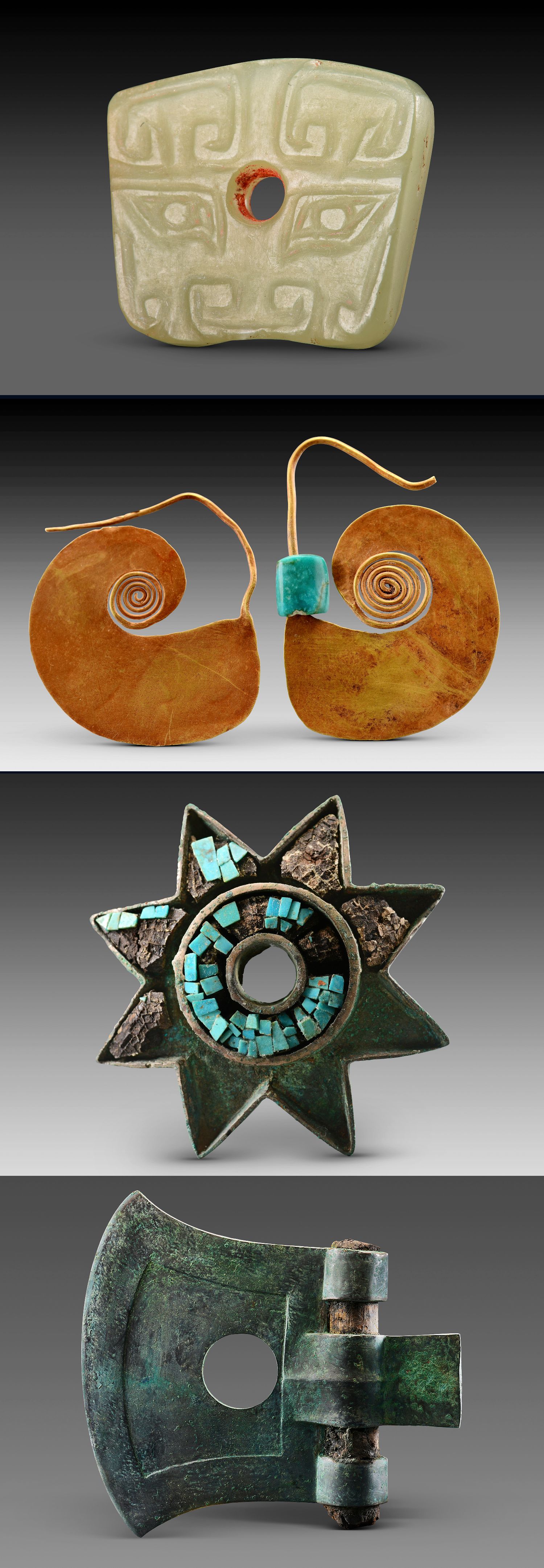拼版照片:陕西清涧后刘家塔墓地出土的玉兽面饰、金耳环、镶绿松石铜饰以及瓦窑沟墓地出土的铜钺(由上至下,资料照片)。