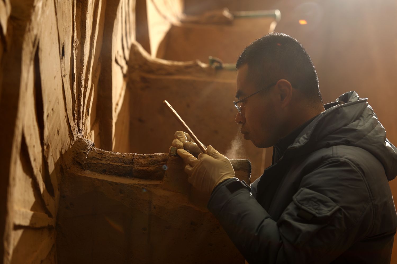 陕西省考古研究院寨沟遗址考古队队员于有光在陕西清涧瓦窑沟墓地M8号墓葬清理车马器(2023年12月5日摄)。