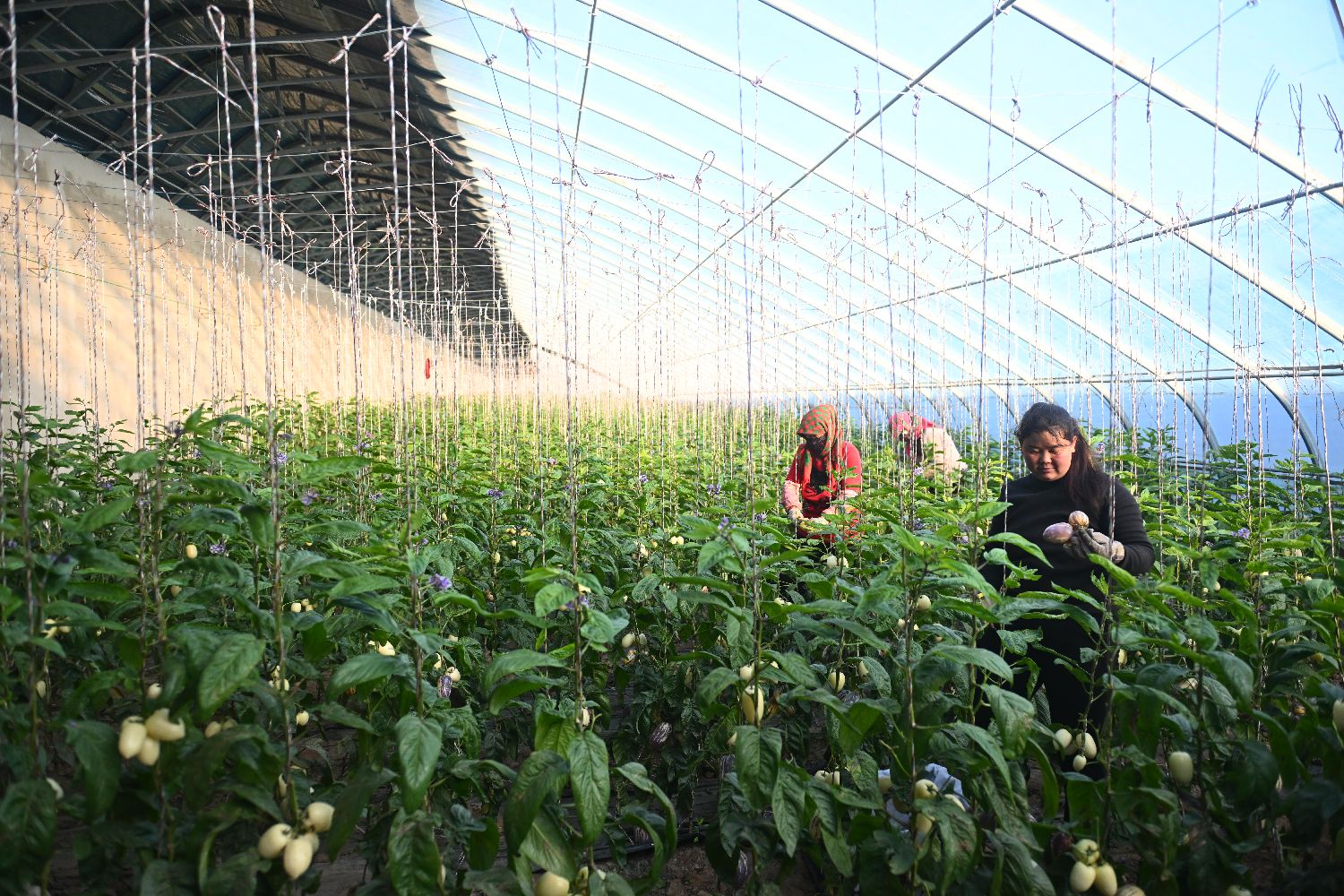 12月17日,灾后恢复重建的蔬菜大棚内,安置人员进行采摘工作。