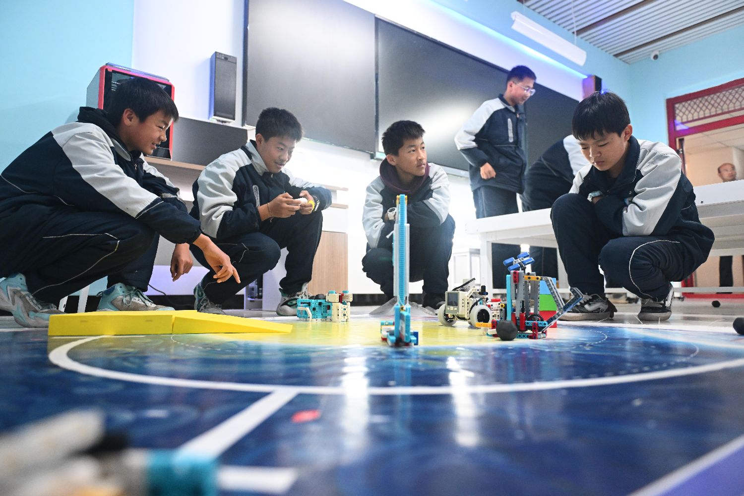 12月18日,灾后恢复重建的积石山县第五中学内,学生进行机器人编程学习。