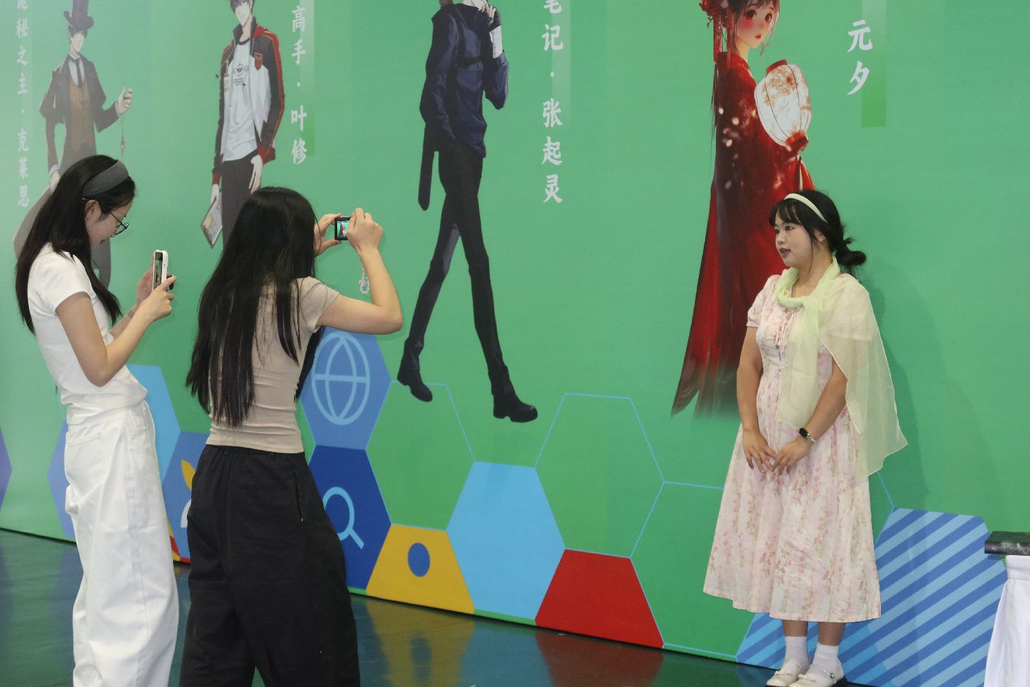 9月26日,2025中国国际网络文学周在浙江杭州开幕。图为读者与小说IP人物合影。(图片来源:中新社)