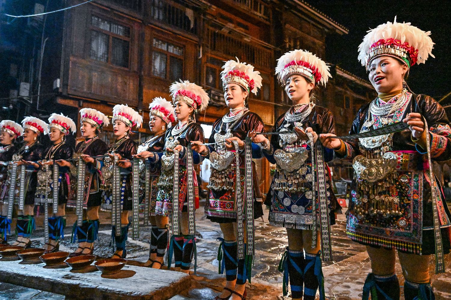 在贵州省黎平县肇兴侗寨,侗族同胞与来宾在侗年活动中共享长桌宴。随着一年一度侗年的到来,位于贵州东南部山区的黎平县肇兴侗寨迎来了天南海北的游客,古朴的深山侗寨愈显热闹起来。(图片来源:本文图片均自新华社)
