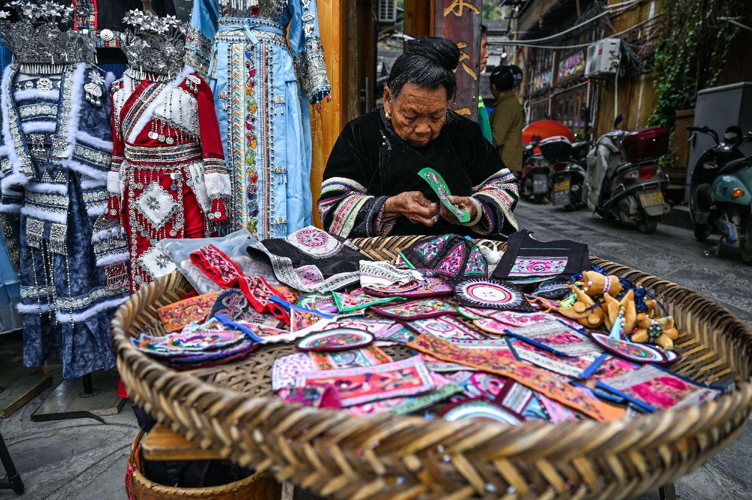 贵州省黎平县肇兴侗寨的村民在刺绣。