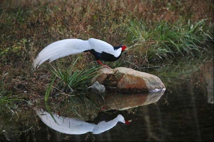 牯牛降国家级自然保护区,野生白鹇下山觅食、嬉戏。(图片来源:徐明/摄)