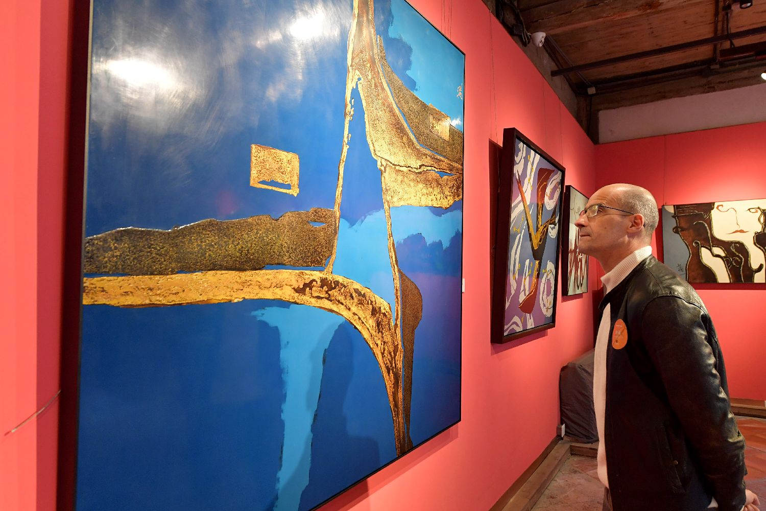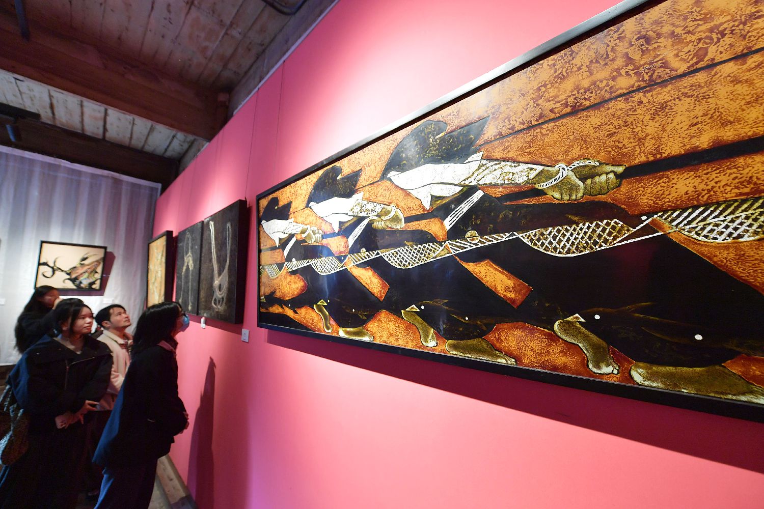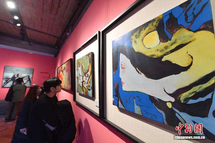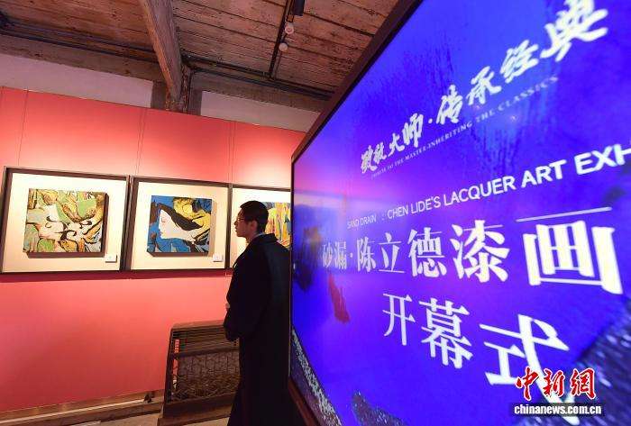 图为参观者在参观展出的漆画作品。(图片来源:中新网)