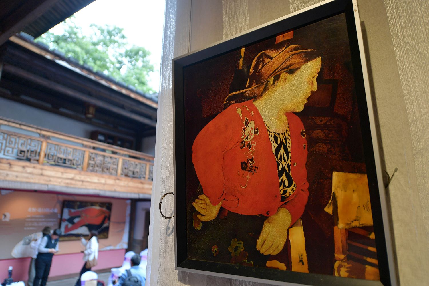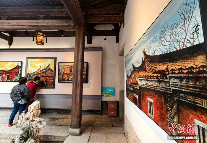 图为参观者在参观展出的漆画作品。(图片来源:中新社)