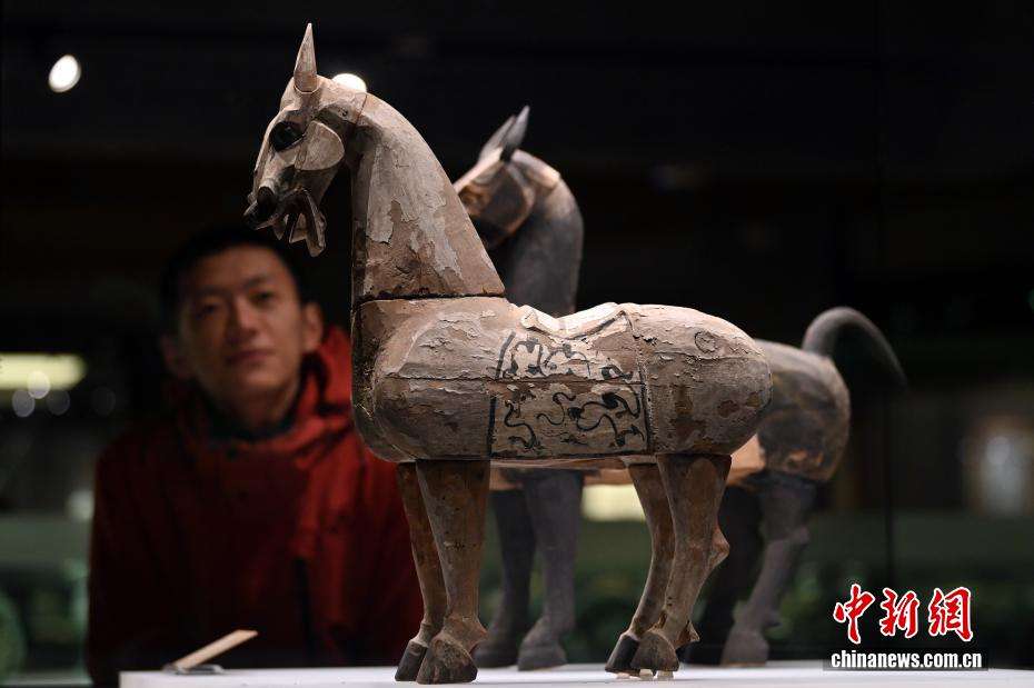 12月24日,在位于兰州的甘肃省博物馆丝绸之路文明展厅内,游客参观汉代墨绘木马。
