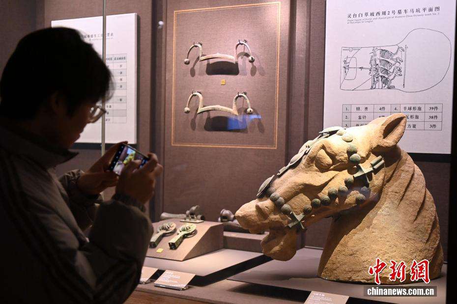 12月24日,在位于兰州的甘肃省博物馆丝绸之路文明展厅内,游客参观西周时期的马络头饰。
