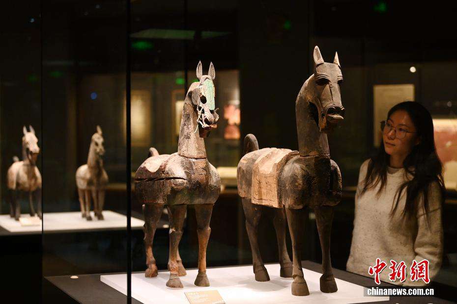 12月24日,在位于兰州的甘肃省博物馆丝绸之路文明展厅内,游客参观汉代墨绘木马。