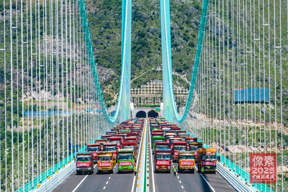 作为大国经济“顶梁柱”,超级工程打开发展新天地,科技创新激活新质生产力。花江峡谷大桥于2022年1月开工建设,2025年9月28日正式通车运营。因跨越被誉为“地球裂缝”的花江大峡谷而得名。大桥全长2890米,主桥跨径1420米,桥面到水面高度625米。大桥建成,主桥跨径居山区桥梁跨径世界第一、桥梁高度居世界第一,可谓“横竖”都是世界第一。图为8月25日,贵州花江峡谷大桥荷载试验现场(无人机照片)。