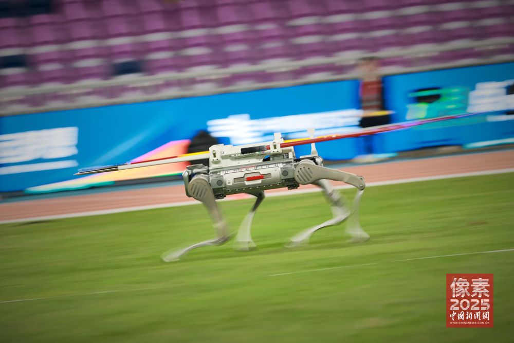 具身机器人展现出奔涌向前的活力、动力和潜力,带领中国科技从“跟跑”跨越到“领跑”,智能机器人正以前所未有的广度与深度融入人们的日常生活。图为第十五届中国全国运动会田径男子十项全能在广东省奥体中心体育场进行,机器狗叼着标枪满场飞奔的“打工”日常引人关注,本届全运会成为展示粤港澳科技创新实力的绝佳窗口。粤港澳三地深度融合的科创链条,为第十五届全运会增添一抹靓丽色彩。
