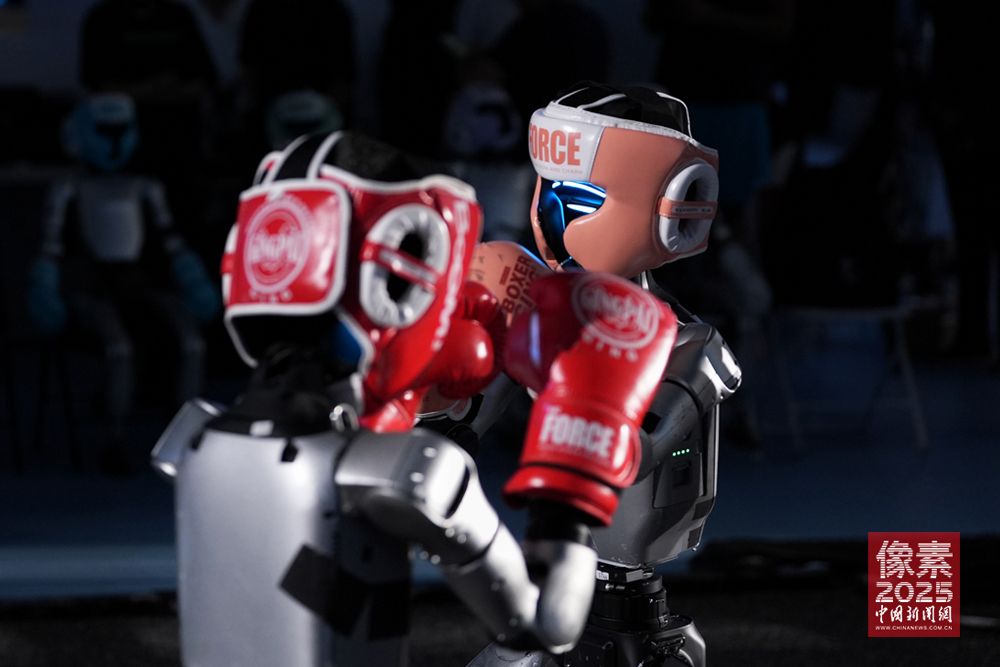 8月14日至17日,2025世界人形机器人运动会在北京国家速滑馆(冰丝带)举行。来自全球五大洲16个国家的280支队伍、500余台人形机器人将展开26个赛项、538个比赛项目的竞技对决。这次运动盛会不仅展现了未来的科技锚点,更显露了中国人形机器人从研发制造、到销售出货,各个环节都跑出了“加速度”。图为8月13日,在北京国家速滑馆,两台宇树科技机器人训练自由搏击项目。