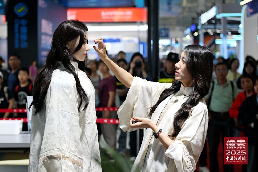 仿生人形机器人、会说相声的机器人、巡检机器人、家庭服务型机器人、搬运机器人……在第八届数字中国建设峰会现场体验区,人形机器人活跃在迎宾、交流、表演等场景,让人大开眼界。家庭—社区—城市—工业,人形机器人已实现全场景覆盖,正开辟无限可能。图为4月30日,真人(右)在峰会现场体验区与按其外貌定制的仿生机器人“小思”共同登台。此次为该机器人的首次公开亮相。高精度仿生人脸、音色复刻,具备眼睛、表情、口型、动作的多种变化。