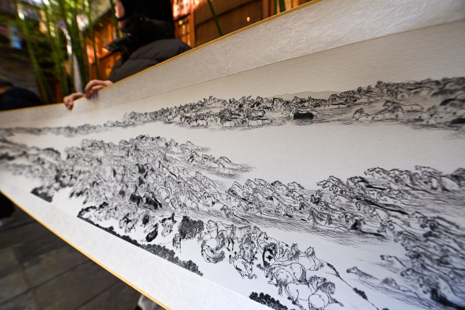 12月29日在天津古文化街“喜迎马年,五代画马人马画艺术展”上拍摄的画家宫春虎的作品《万马图》(局部)。(图片来源:本文图片均据新华社)