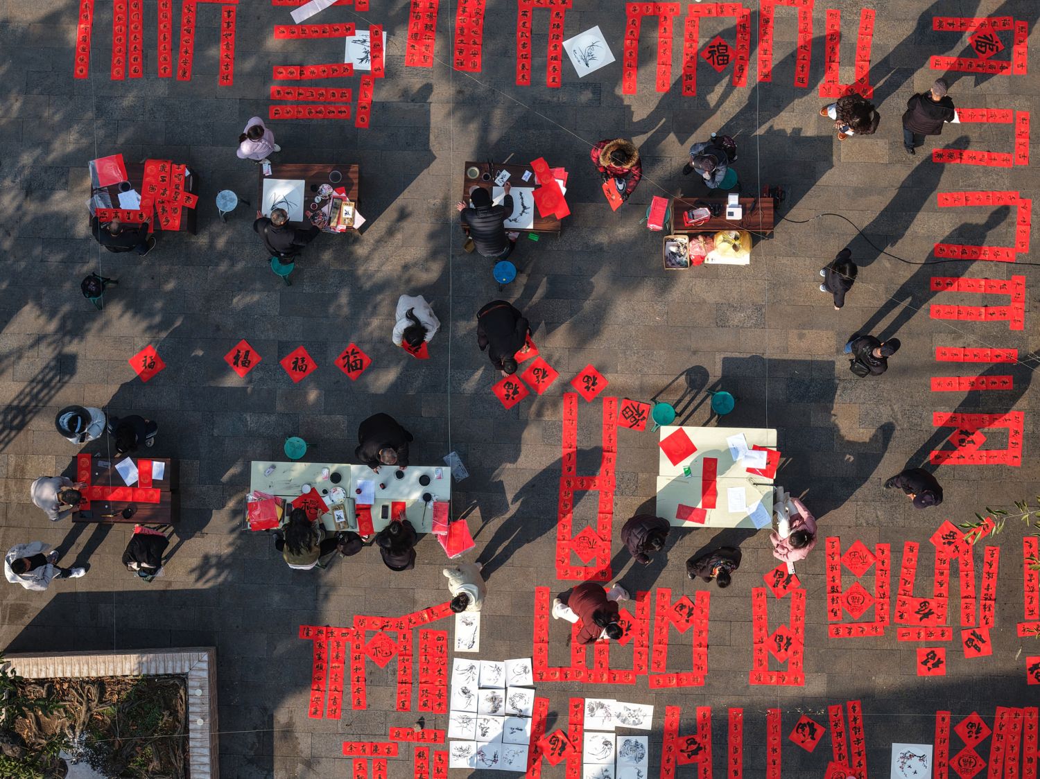 12月29日,四川省攀枝花市文学艺术界联合会组织书法爱好者在米易县丙谷镇为当地居民写春联(无人机照片)。