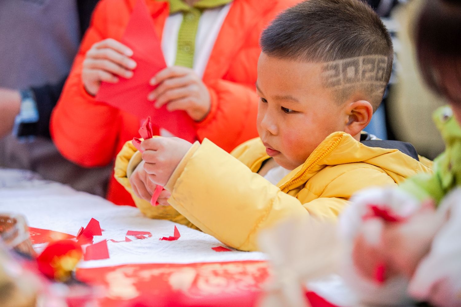 12月28日,在浙江省温州市鹿城区双屿街道垟田社区,小朋友在剪窗花。