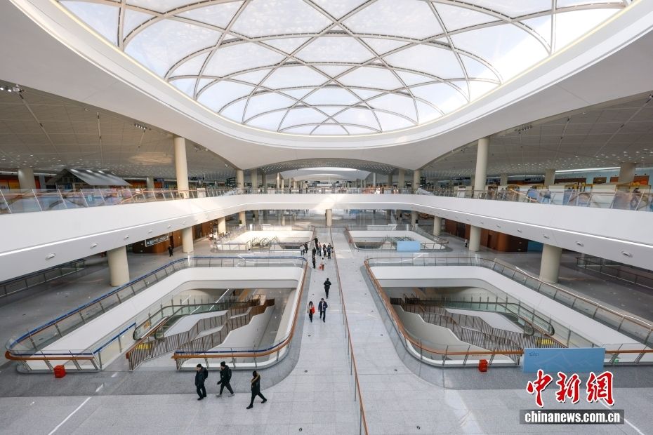 图为2025年12月30日,阳光透过“京帆”映入北京通州站地下候车大厅。(图片来源:本文图片均据中新网)