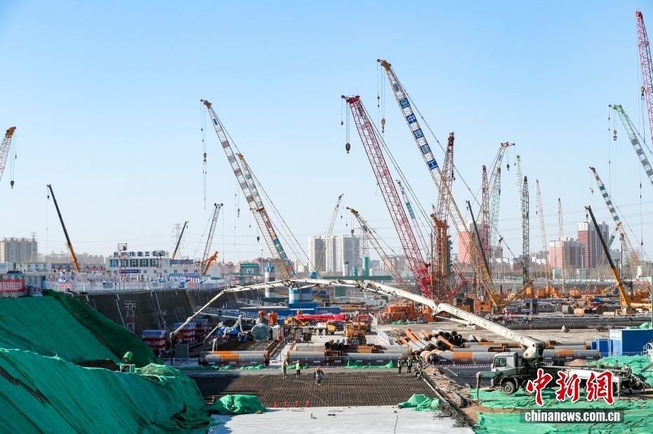 图为2021年2月16日,枢纽建设初期,打桩机林立。