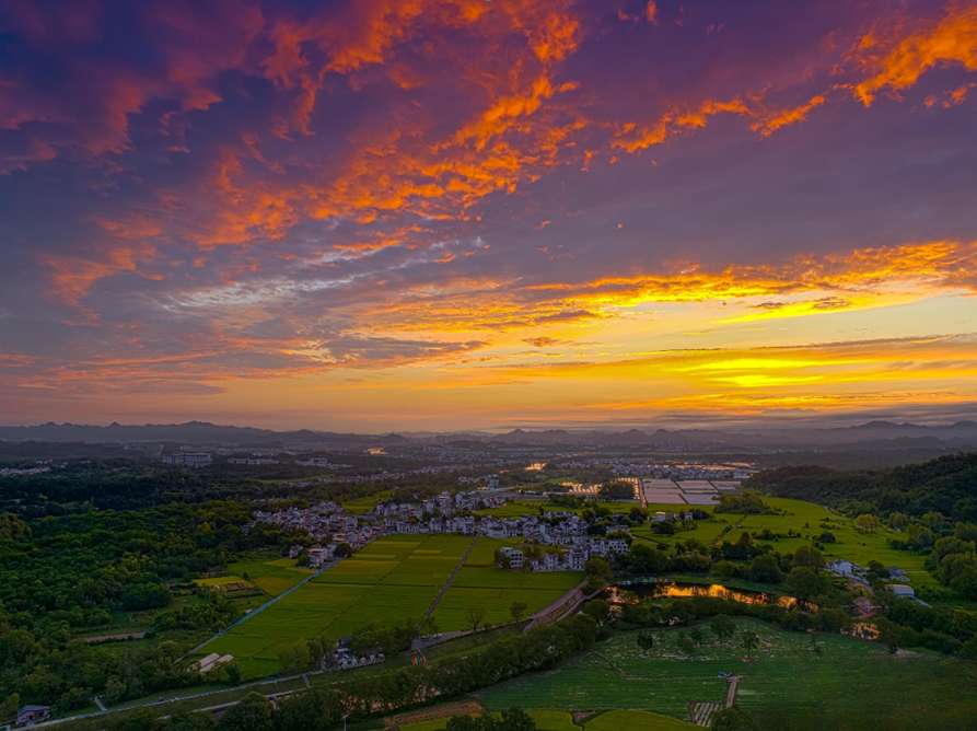 在黄山市屯溪区黎阳镇傍霞村,绚烂的朝霞铺满天空。(图片来源:樊成柱 摄)