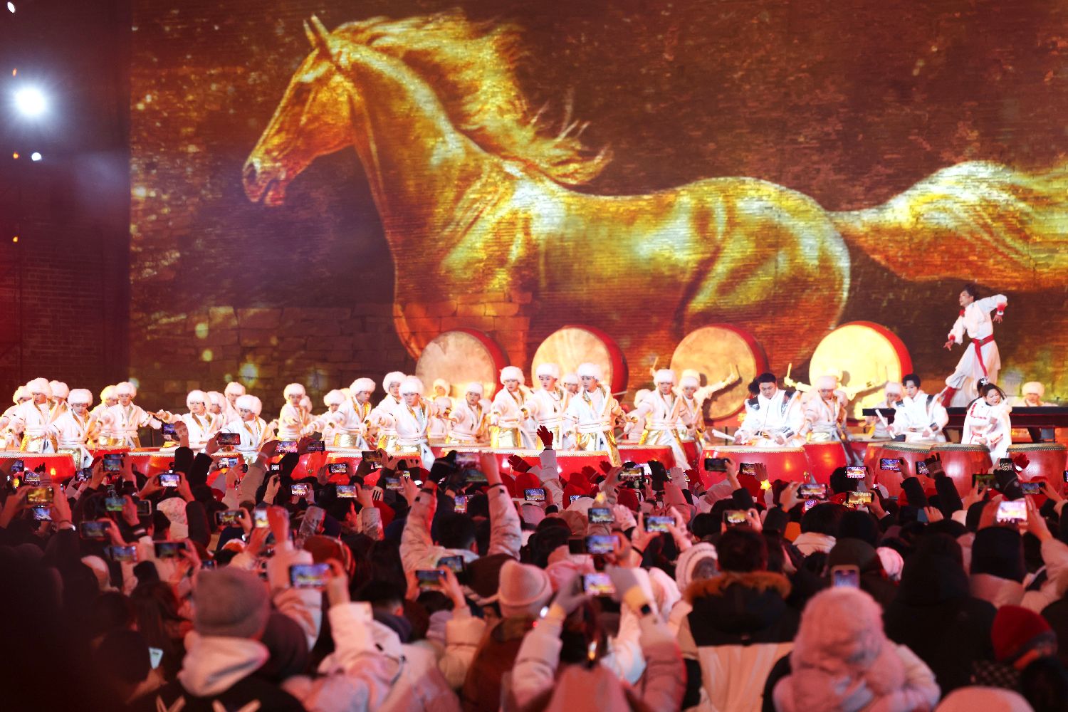2025年12月31日晚,新年倒计时活动现场举行鼓阵表演吸引现场观众拍摄。