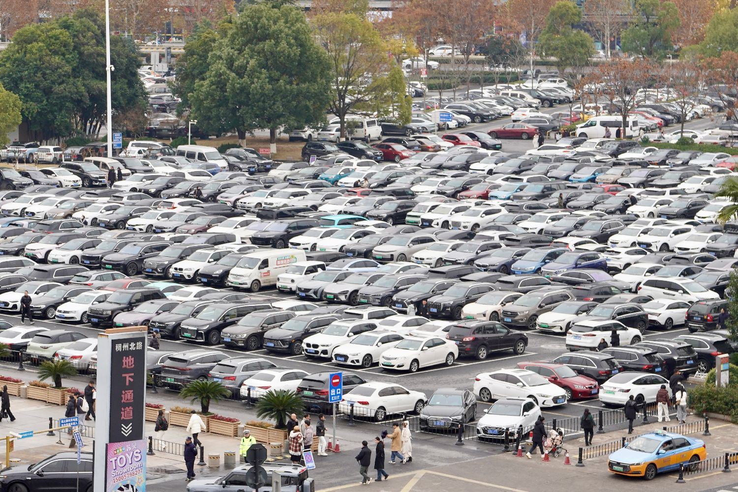 1月1日,义乌国际商贸城一区门前的停车场已满。(图片来源:中新社)