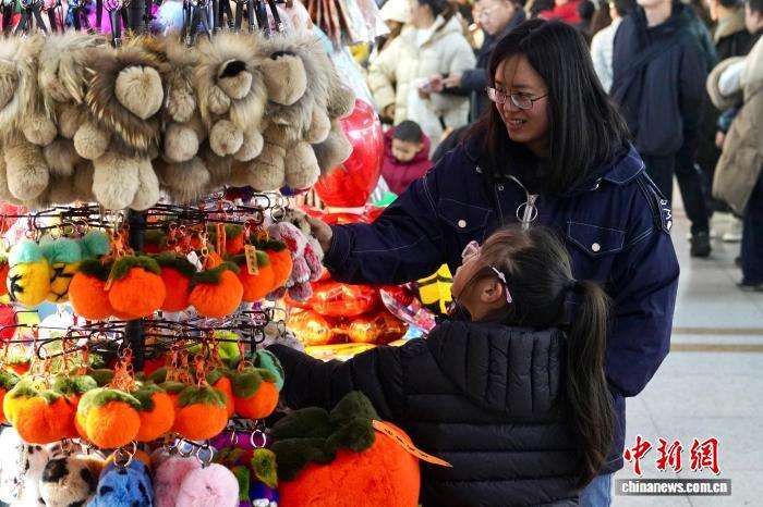 1月1日,两位消费者查看店铺在售的毛绒挂饰。(图片来源:中新网)