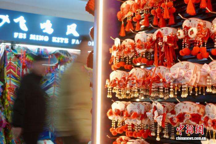 1月1日,消费者从挂满中国风头饰的展板前走过。(图片来源:中新网)