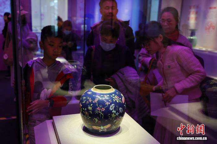 1月3日,海南海口,展出的清代《蓝地粉彩花蝶纹罐》吸引参观者。