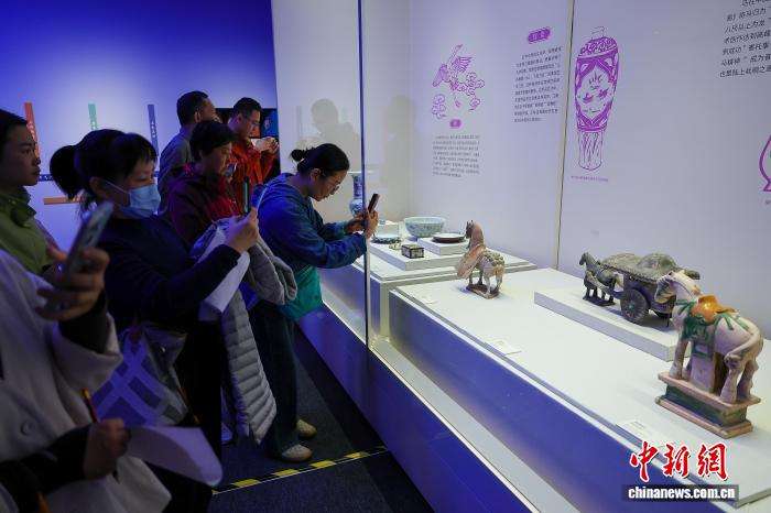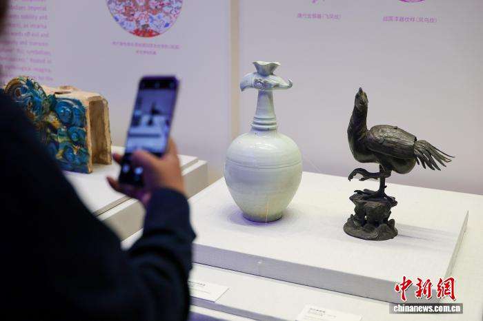1月3日,海南海口,参观者用手机拍摄展出的《青白釉花口凤首壶》《铜凤凰香薰》(右)。(图片来源:本文图片均据中新网)