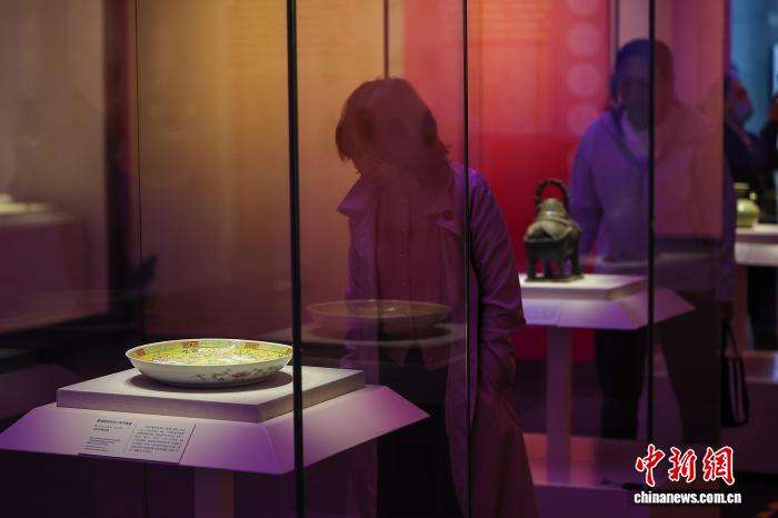 1月3日,海南海口,展出的《黄地粉彩开光三羊开泰盘》《灰陶象尊》(右)吸引参观者。