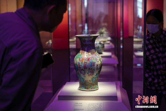 1月3日,海南海口,展出的清代《广彩和合二仙纹瓶》吸引参观者。
