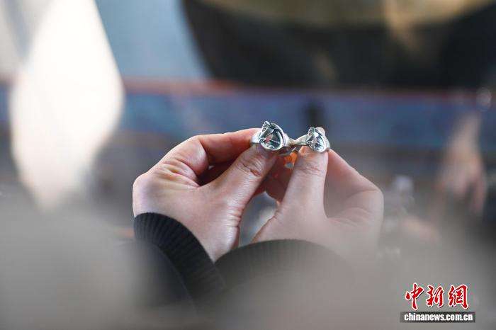 1月6日,在位于甘肃省酒泉市肃北蒙古族自治县一银饰工作室内,顾客试戴马年银饰文创产品马头对戒。