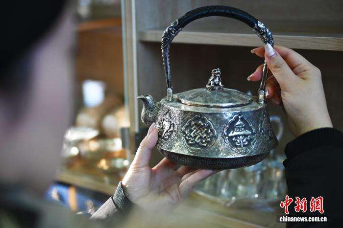 1月6日,在位于甘肃省酒泉市肃北蒙古族自治县一银饰工作室内,顾客挑选雪山蒙古族银质茶壶。