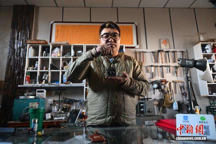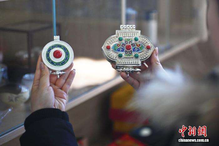 1月6日,在位于甘肃省酒泉市肃北蒙古族自治县内一银饰工作室内,雪山蒙古族银饰技艺传承人乌德木图展示自己打造的马年银饰。