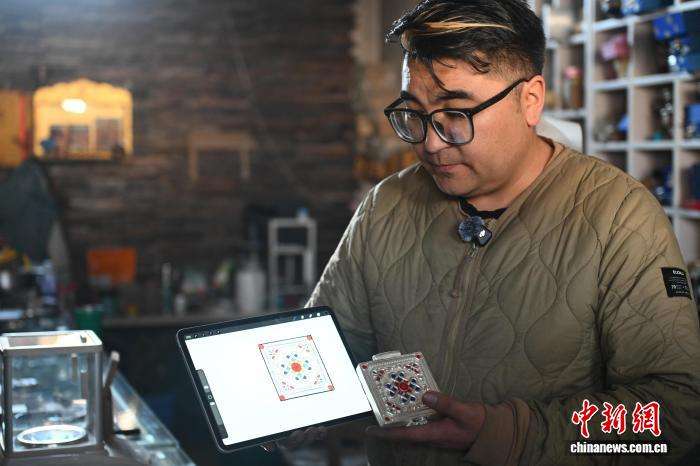 1月6日,在位于甘肃省酒泉市肃北蒙古族自治县内一银饰工作室内,雪山蒙古族银饰技艺传承人乌德木图展示银饰设计图与实物。