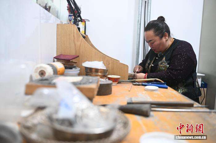 1月6日,在位于甘肃省酒泉市肃北蒙古族自治县一银饰工作室内,雪山蒙古族银饰技艺传承人金花进行银饰制作。从小生活在大草原的金花钟爱银饰加工,面对机械加工逐渐取代手工制作,她一直坚守纯手工制作雪山蒙古族银饰。金花不仅制作出了肃北第一套卫拉特蒙古族女士头饰的全套饰品,还获得不少手工艺方面的奖项,带了徒弟。(图片来源:本文图片均据中新网)