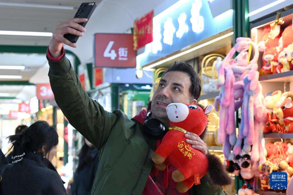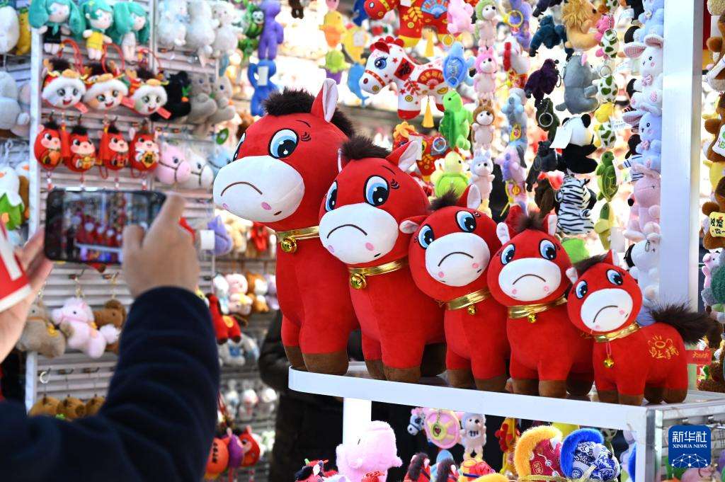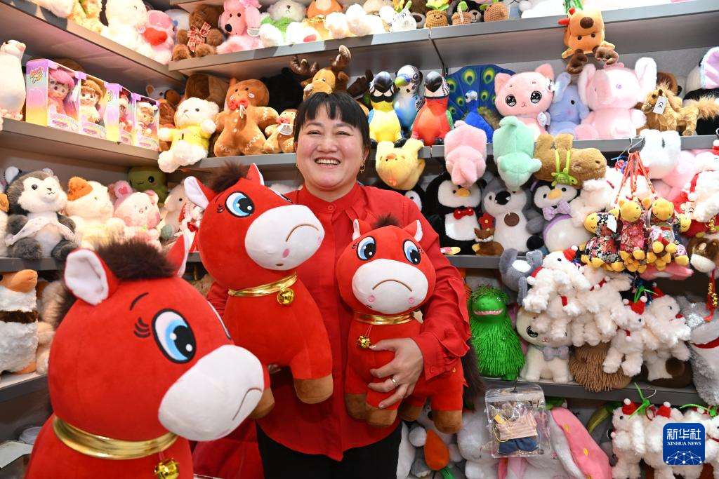 1月12日,在浙江义乌市国际商贸城一区玩具销售区,市场经营户“开心姐妹”负责人张火清展示销售的“哭哭马”小马公仔玩具。(图片来源:本文图片均据新华社)