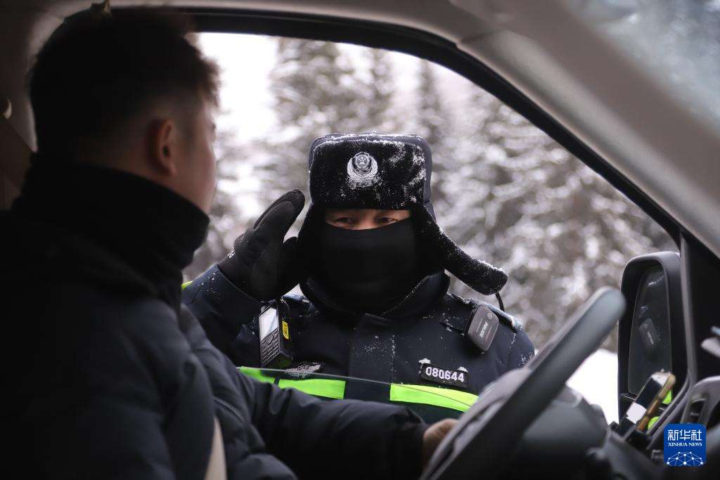 1月13日,在新疆喀纳斯景区贾登峪服务区大森林路口,辅警吾瓦提汗·巴合提别克对往来车辆进行安全提示。