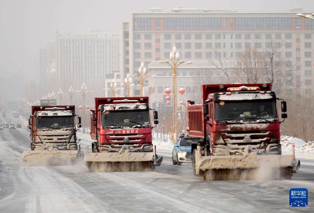 1月13日,清雪车辆在新疆阿勒泰市道路上除雪。(图片来源:本文图片均据新华社)