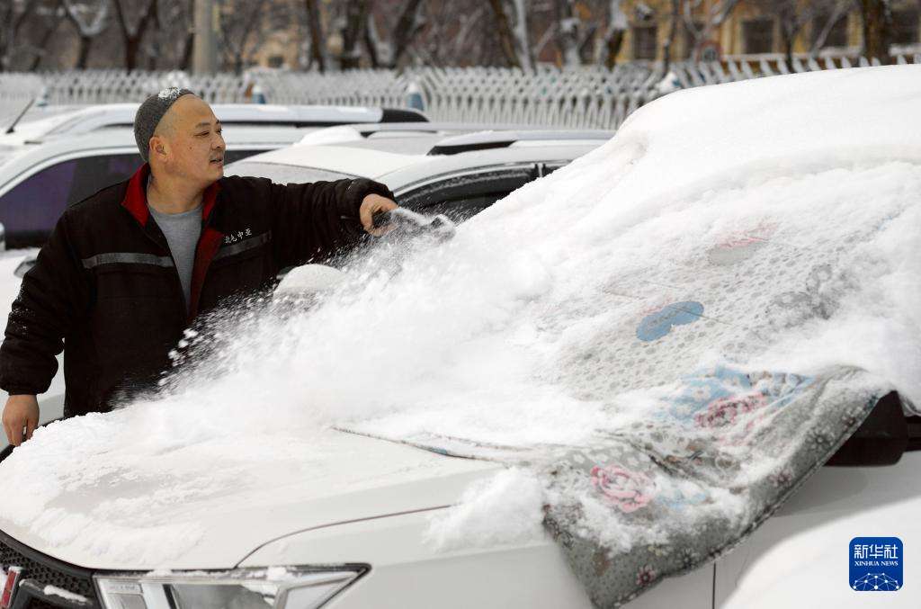 1月13日,新疆阿勒泰市民清理车辆上的积雪。