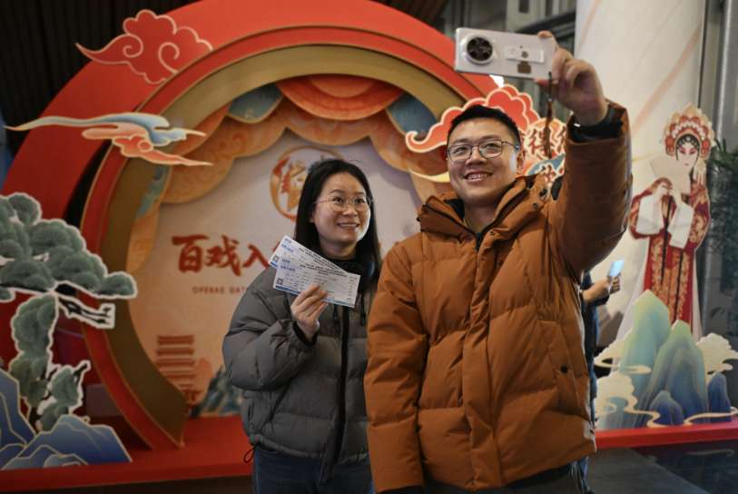 1月11日,在合肥大剧院,观众手拿《穆桂英挂帅》演出票根拍照留念。(图片来源:中新社)