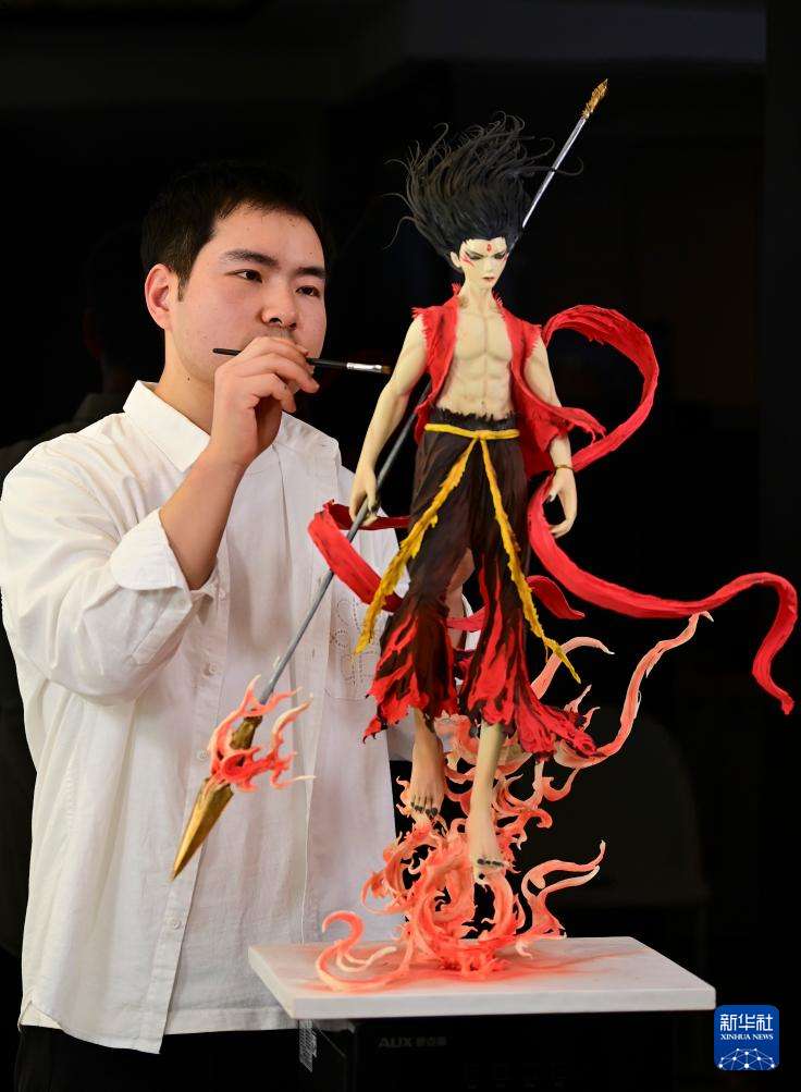 糖艺师张勃在为糖艺作品《哪吒》上色(1月13日摄)。