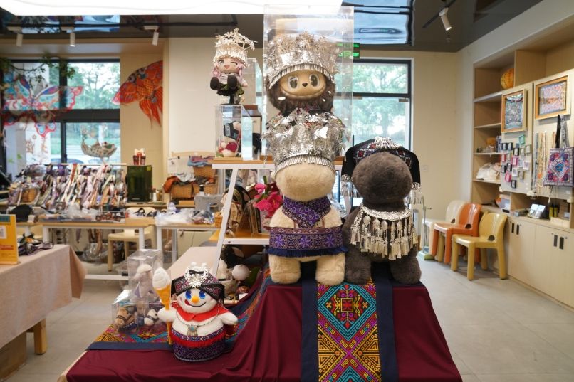 壮锦织带在娃娃额前交叠固定,便成了一个灵动的帽饰;不同纹样的面料按娃娃的身形裁剪,配以流苏、网纱等材料做成裙子……广西壮族自治区博物馆文创商店内的一间手工工坊,陈列着不同尺寸身穿精美民族服饰的拉布布、乌萨奇等玩偶。“我们推出现场定制专属‘娃衣’服务,一年线上线下售出8000件左右。”该工坊手工老师赖世泽介绍。